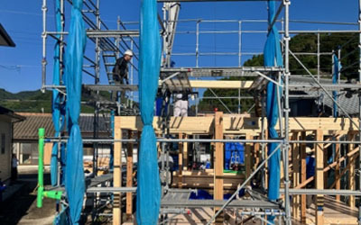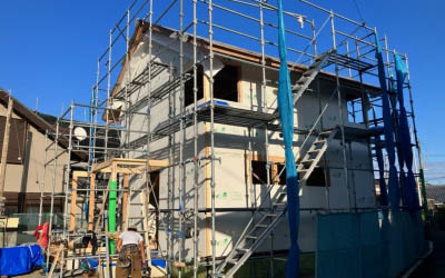 陽も傾きはじめ、耐力面材であるモイスを張り上げ本日の建て方工事は完了となりました。