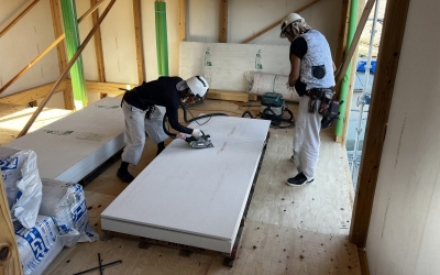 棟上げ後にまず行う工程が「耐力面材」の取付です。