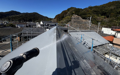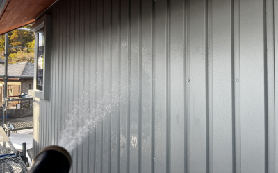 洗浄後は、波型の外壁を丁寧に拭き上げます。