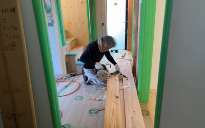浮造り仕上げの杉の無垢材を一枚ずつ納めていきます。