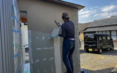 外壁の塗り仕上げ中です。さすがのコテ使い。