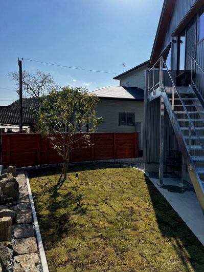 芝生を敷き並べゴロタ石で全体を締めすべての工事が完了しました。