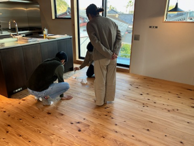 現場を担当したDさん、サッシや設備機器などの取り扱い方法から木の家での暮らしかたのポイントを丁寧にご説明。。