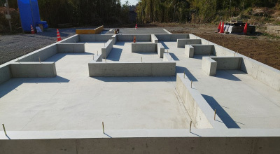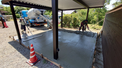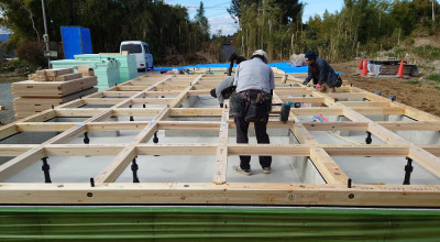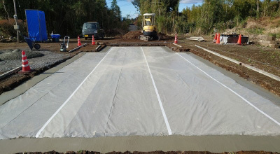 写真は重機で鋤取りを行ったあとに防湿シートを敷き、均しコンクリートを打設した状況です。