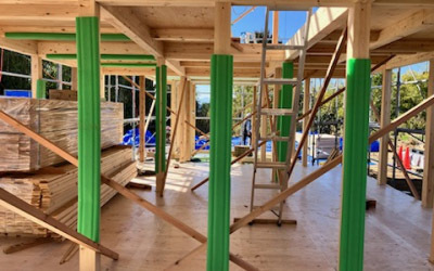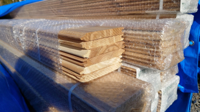選抜された大切な構造材を汚れや傷から守るためにクッション材で養生します。