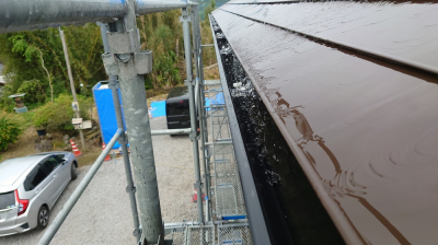 写真は足場解体前の洗浄及び施工の最終チェックを行っている状況です。