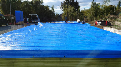 さらに念には念を! その上から厚手のシートでラッピングを行い2重の雨養生です。