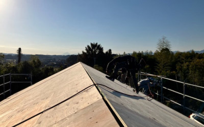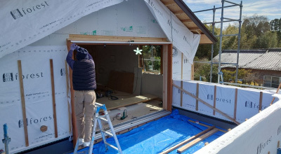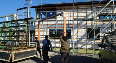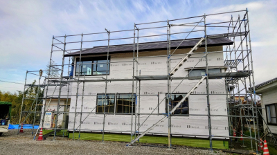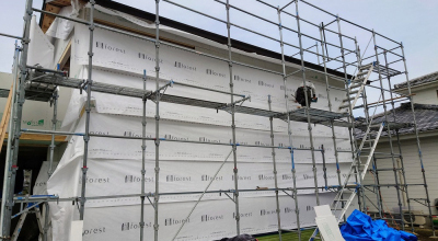 屋根は防水シートでしっかりと雨仕舞し、建物全体を厚手のシートで丁寧に包み込み建て方工事が完了しました。