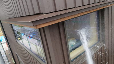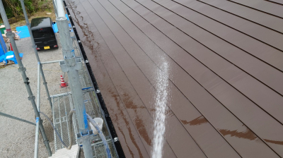屋根の棟部分から勢いよく水を流し、排水状況を確認しています。