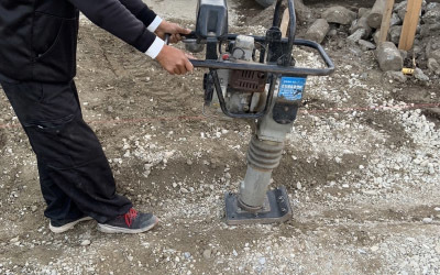 鋤取りが終わると全体に砕石を入れ、専用の機械で転圧。