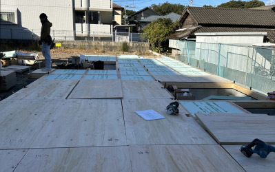 断熱材が入ると上から構造用合板を敷設。