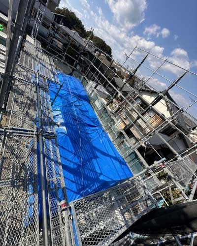 上棟までの間、雨や汚れから守る為 ブルーシートでしっかり養生を行いました。