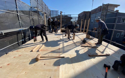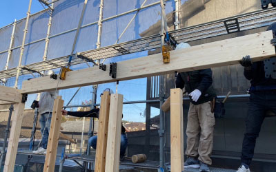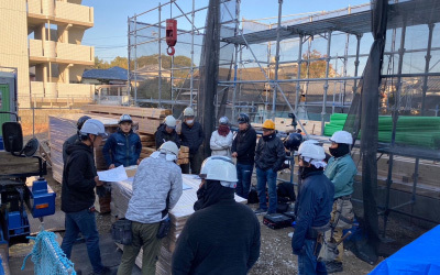 足場の組まれた現場に早朝から大工さんが集結します。