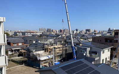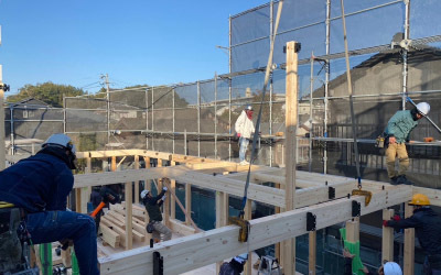 建て方工事、1日で簡単に出来上がるようにも感じますが 現場担当者の膨大な準備期間と大工さんをはじめとする各職人さんたちとの 入念な打合せ、現場での連携プレーの積み重ねで今日の日を迎えます。