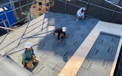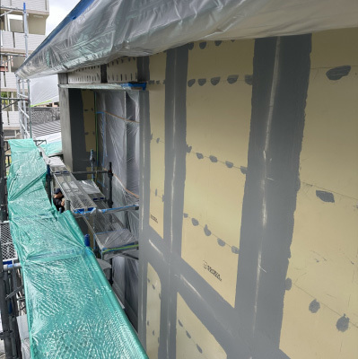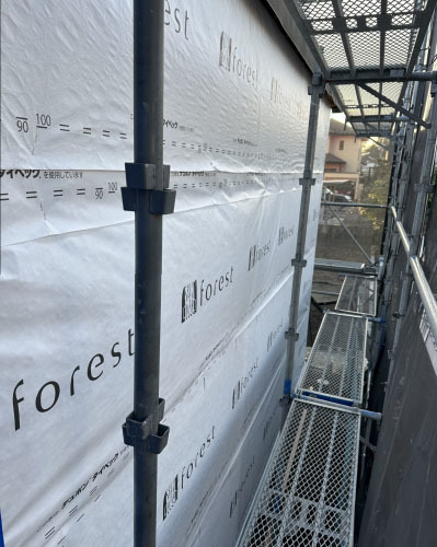 面材が張り終わった所から1回目の透湿防水シートでラッピング。