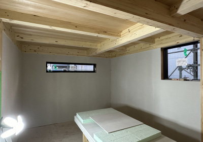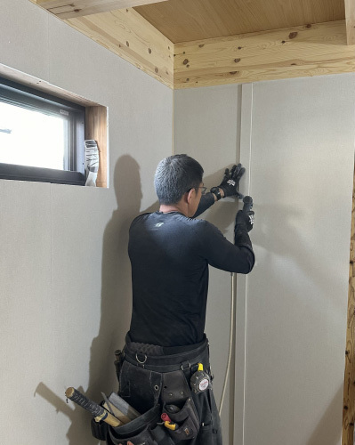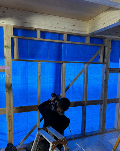 未だ骨組み状態の建物に壁の下地材をいれていきます。