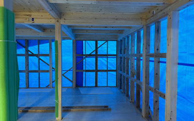 屋根をしっかり雨仕舞いして、建物全体をブルーシートで丁寧に包み、建て方工事完了です!