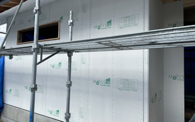 サッシ廻りの下地も入れたら外部の構造面材張りへと進みます。