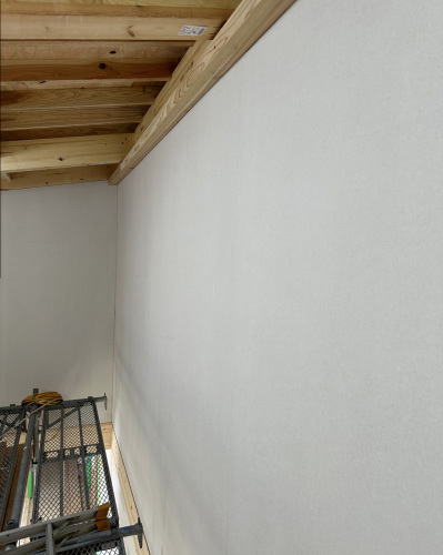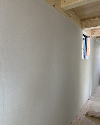 骨組み状態だった建物も構造面材を貼ることにより剛性が大幅にアップ。