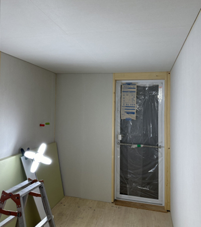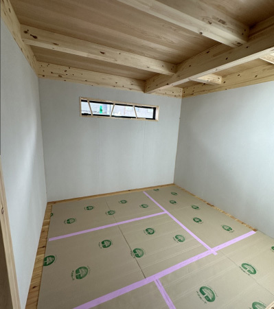 内部では床張りも終わり養生材で保護。