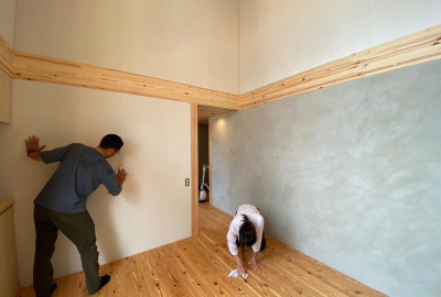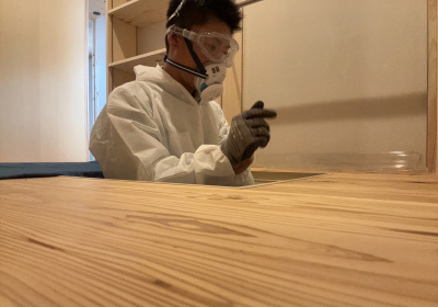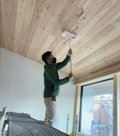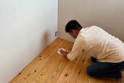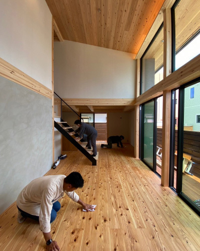 工事期間中続けてきた磨きも今回で最終回。 お施主様ご家族の生活が始まり、毎日触れる床や壁、柱を丁寧に磨いていきます。