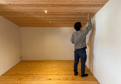 まずは規則的に下地材を配置し 端から1枚ずつ無垢の杉板を張っていきます。