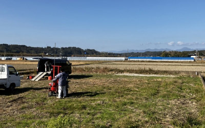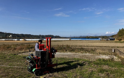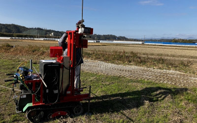 土地の四隅と中心に穴を開け、長い棒を差し込み、その抵抗力を測定していきます。