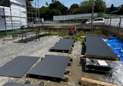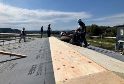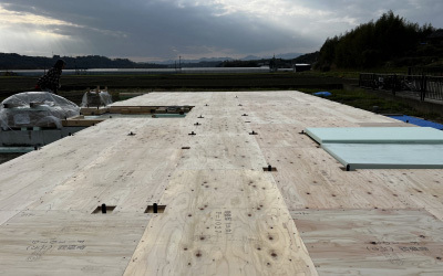 まずは養生されたブルーシートを剥がして耐力面材の施工へ。