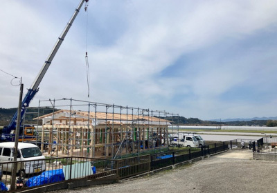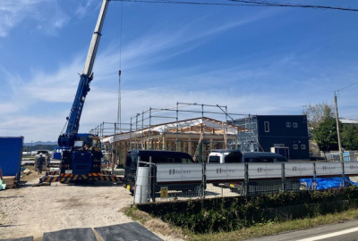テンポよく進む建て方、棟が上がったところでお昼となりました。