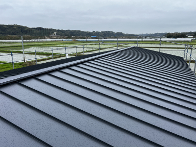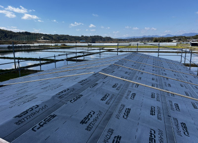 屋根には分厚いゴム製のアスファルトルーフィングで雨仕舞いし、補助木材をうち重ね風への対策もOkです!
