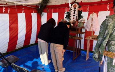 お施主様が神前にお参りし、工事の安全を願います。