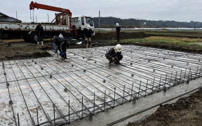 底盤部分の砕石・転圧、防湿フィルム施工を終え、鉄筋の配置へ。