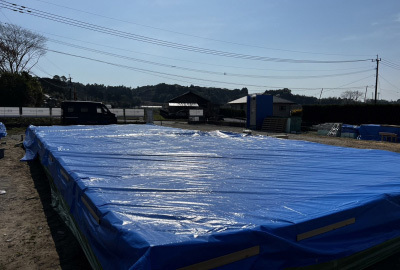 透明の保護シートで全体を覆い、厚手のブルーシートで更に全体を包みます。