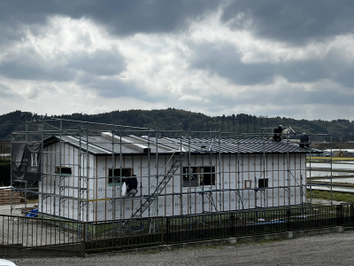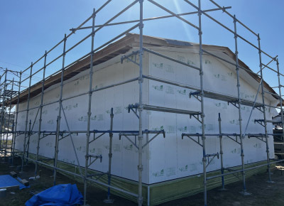 最後に厚手のシートで建物全体をラッピングし本日の建て方工事が完了しました。