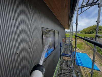 防水工事を経て足場解体の前に、外部全般の『磨き』を行いました。