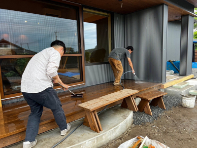 天井や梁・壁、ソトとナカをつなぐWood deckも丁寧に心をこめて磨きました。
