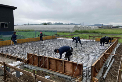 基礎の外周には型枠も組んでいき第三者機関による検査に向け工事を進めて行きます。
