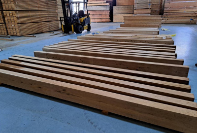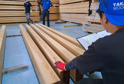 様々な表情の木目をした材料を「どの部分の柱や梁」に使うか選定する大事な作業です。