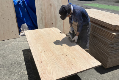 棟梁が床に敷詰める厚み28mmの合板(下地材)を加工中。