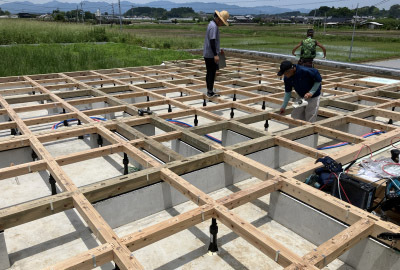 土台敷の作業には6人の大工さんが集結し手際良く流れるように作業が進んでいきます。