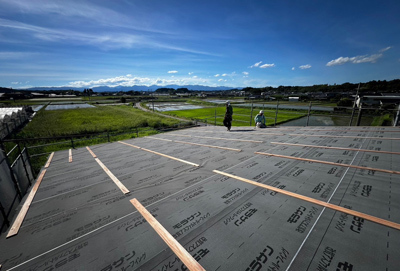 日が西へ傾きはじめるころには建て方工事も最終工程へうつり屋根をルーフィングで覆っていきます。