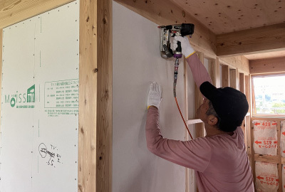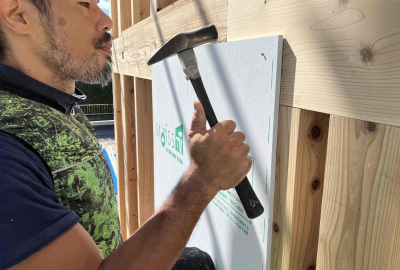 耐力壁面材を施工する際は決まられた釘のサイズ・間隔など施工基準と照らし合わせながら施工していきます。