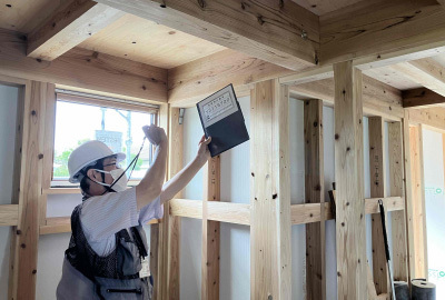 検査では定められた設計施工基準をもとに、屋根や窓廻りの防水処理、耐力壁の位置や釘の仕様・間隔など適切かどうか確認していきます。