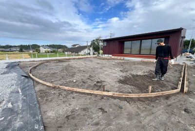 基礎工事は遣り方(やりかた)という工程からスタートし、砕石、転圧とベースとなる基礎の下地を造っていきます。