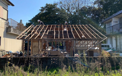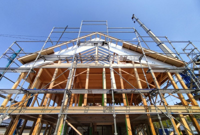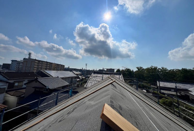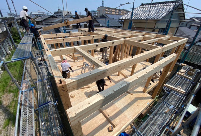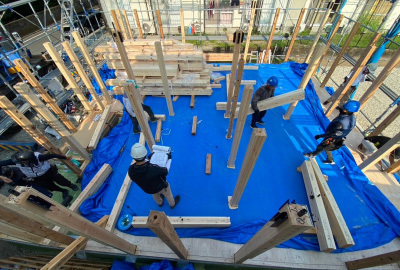 工事も終盤戦...屋根が組まれ、お家のカタチが姿を見せはじめます。