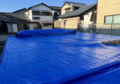 最後にブルーシートで建物全体を丁寧に包み、建て方工事完了です!