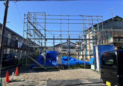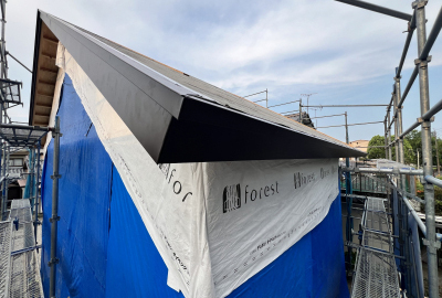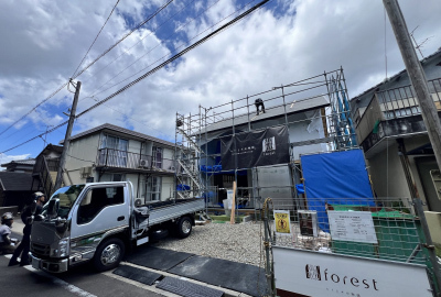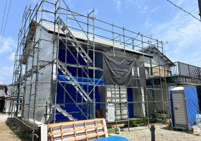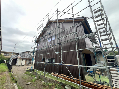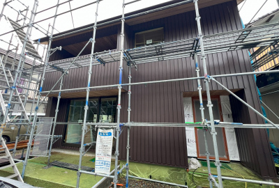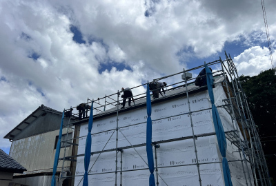 外壁を張り終えた後は防水工事を施し、いよいよ足場の解体です!