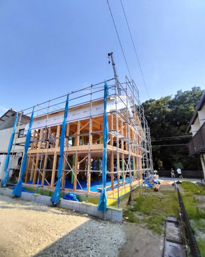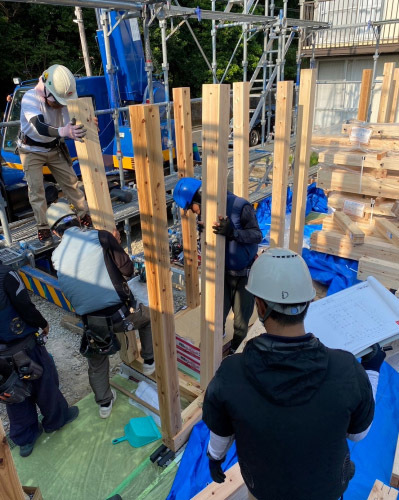 8月吉日、「巡り住む家」の現場にて建て方工事が行われました。