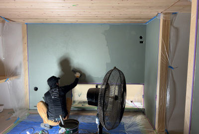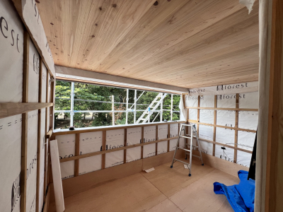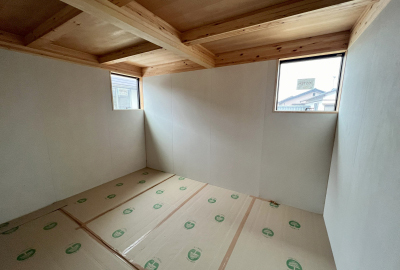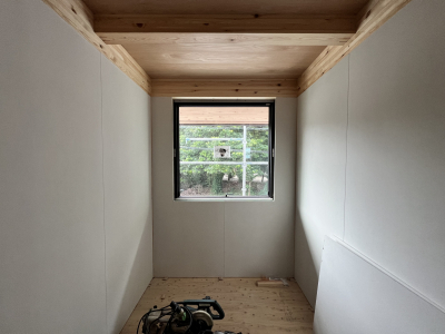 そして内部では棟梁が仕上げ材「モイス」張りを始めております!