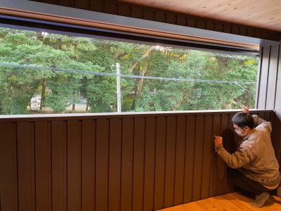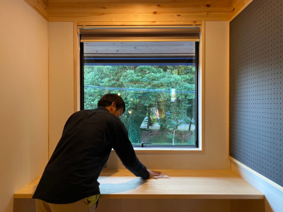 フォレストオリジナルの造作家具を磨く。